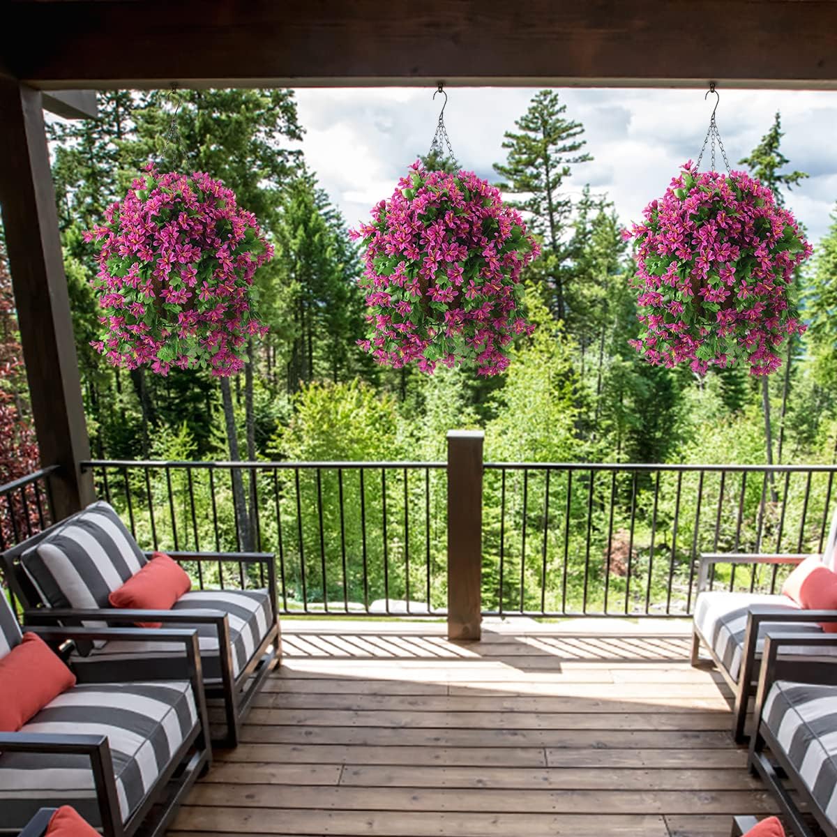 Artificial Flowers in Hanging Basket for Outdoors Indoors Decor, Artificial Mums Bush Flowers Plants with Baskets for Home Porch Garden Yard Patio Decoration (Rose red)