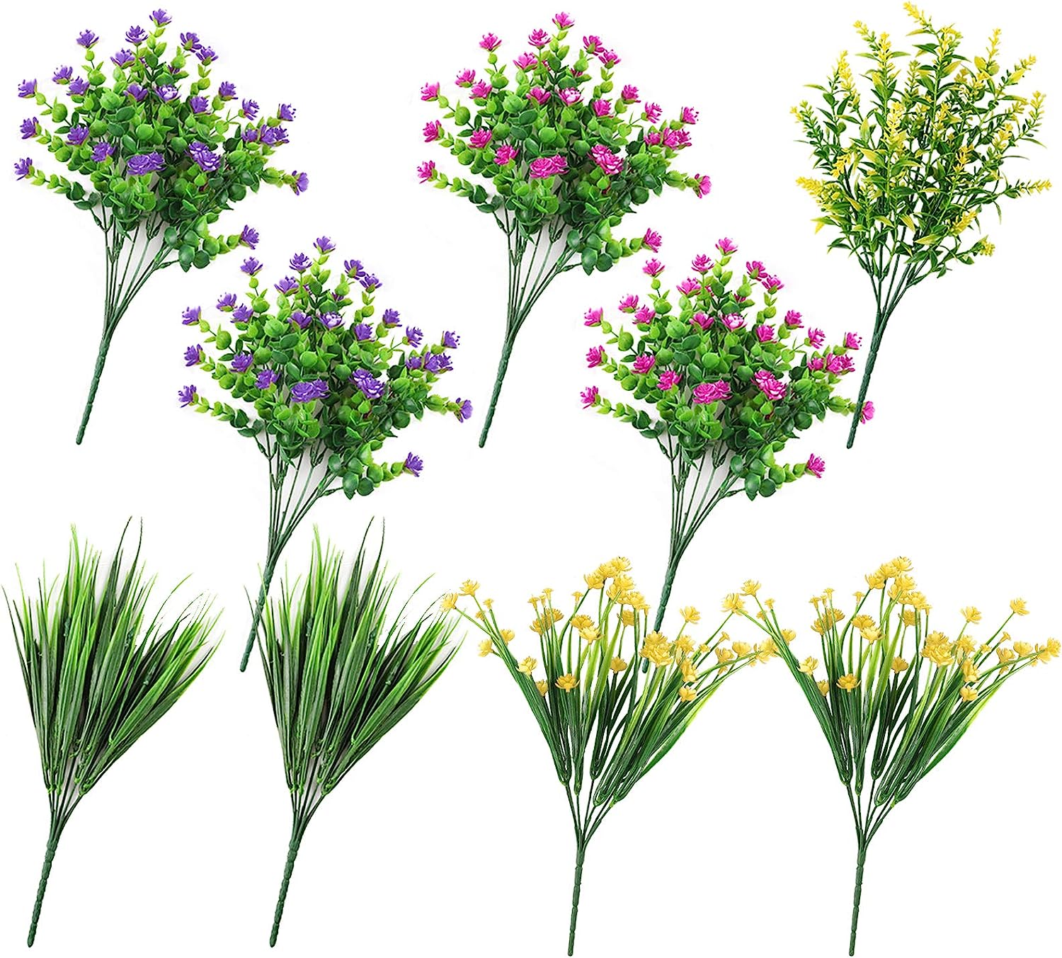 Colovis 9pcs Artificial Flowers Outdoor UV Resistant Fake Plants Greenery Shrubs Faux Plastic Flower in Bulk for Indoor Outside Hanging Planter Porch Cemetery Pots Decoration (Yellow, Purple, Green)